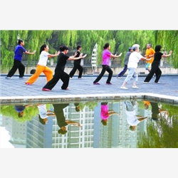 在朝阳区庆丰公园,市民打起太极拳,池塘的清水中映衬出他们健康快乐的身影