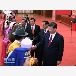 人民大会堂宴会厅灯火辉煌,欢声笑语,洋溢着喜庆热烈的气氛。19时45分,在欢快的乐曲声中,习近平等党和国家领导人走进会场,全场响起热烈掌声。习近平等微笑着同身着民族服装的少数民族代表委员亲切握手、互致问候。