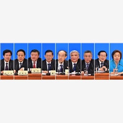 3月6日,全国政协十三届一次会议在北京人民大会堂举行记者会,民主党派中央和全国工商联领导人回答记者提问。这是民革中央主席万鄂湘(左五)、民盟中央主席丁仲礼(右四)、民建中央主席郝明金(左四)、民进中央主席蔡达峰(右三)、农工党中央主席陈竺(左三)、致公党中央主席万钢(右二)、九三学社中央主席武维华(左二)、台盟中央主席苏辉(右一)、全国工商联主席高云龙(左一)在记者会上(拼版照片)。新华社发