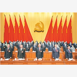 北京会议中心会议厅雄伟庄严、气氛热烈。主席台上方悬挂着镰刀和锤头组成的中国共产党党徽,10面鲜艳的红旗分列两侧。