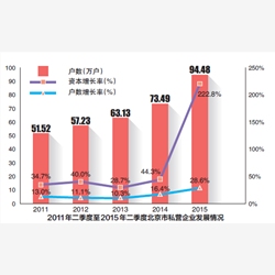 伴随着社会经济结构转型、经济活力的提升,北京市民营企业实现了快速健康发展。数据显示,2011年二季度至2015年二季度,北京市私营企业户数分别同比增长13.0%、11.1%、10.3%、16.4%和28.6%,保持了连年10%以上的高速增长;注册资本分别同比增长34.7%、40%、28.7%、44.3%和222.8%,资本增长幅度远高于同期户数增长幅度。