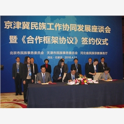 根据《京津冀协同发展规划纲要》总体精神,在广泛沟通协商基础上,4月11日至12日,北京市、天津市、河北省民族工作部门齐聚石家庄,就京津冀三地民族工作协同发展、推动民族团结进步事业等深入座谈,共商良策,签署了《合作框架协议》,开启三地民族工作协同发展之路。北京市、天津市民委主要负责同志、分管领导及相关业务处室,河北省民族宗教厅班子全体成员,相关业务处室及各市(含定州、辛集)民族宗教局长等50人参加会议。