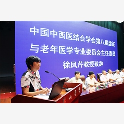 徐凤芹(左一)在中国中西医结合学会虚证与老年医学学术年会上作为主任委员致辞