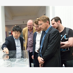 戴琼海(右三)与青年教师和学生讨论仪器项目