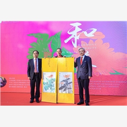 全国政协委员、中国美术家协会理事董希源先生向北京海外联谊会副会长周开让先生、中国世界和平基金会主席李若弘先生分别赠送了《荷风盛世》、《莲心》国画作品。