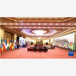 人民大会堂东大厅内,中国和53个非洲国家国旗以及非洲联盟旗帜组成的旗阵恢弘大气、热烈奔放,昭示着中非历久弥坚的友好情谊。