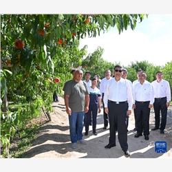 7月12日至15日,中共中央总书记、国家主席、中央军委主席习近平在新疆考察。这是13日下午,习近平在新疆生产建设兵团八师一四三团九连蟠桃种植园考察。新华社记者 谢环驰 摄