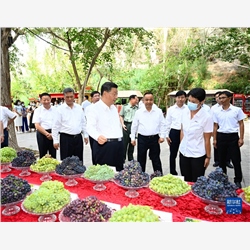 7月12日至15日,中共中央总书记、国家主席、中央军委主席习近平在新疆考察。这是14日,习近平在吐鲁番市葡萄沟察看吐鲁番特色水果展示,了解当地发展葡萄特色产业、促进文旅融合发展等情况。新华社记者 李学仁 摄