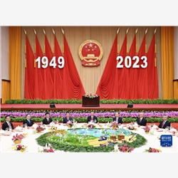 人民大会堂宴会厅华灯璀璨、鲜花绽放,洋溢着喜庆热烈的节日氛围。主席台上方高悬着庄严的国徽,“1949-2023”大字年号在鲜艳的红旗映衬下格外醒目。