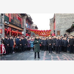 街道上,鼓乐铿锵,舞龙、舞狮表演热闹,喜气腾腾。看到总书记来了,人们热情欢呼起来。习近平走近大家,向天津市民、向全国各族人民拜年。他说,看到市民和游客在欣赏传统民俗表演时喜气洋洋,感受到了浓浓的年味。农历新年是龙年,龙在中华文化中有着勇敢奋进、活力无穷、吉祥如意等多重寓意,寄托着美好的愿景。大家对新的一年要充满信心,把日子过得更好。春节期间,各地可以多举办一些群众喜闻乐见的文化活动,让节日更喜庆、更欢快。